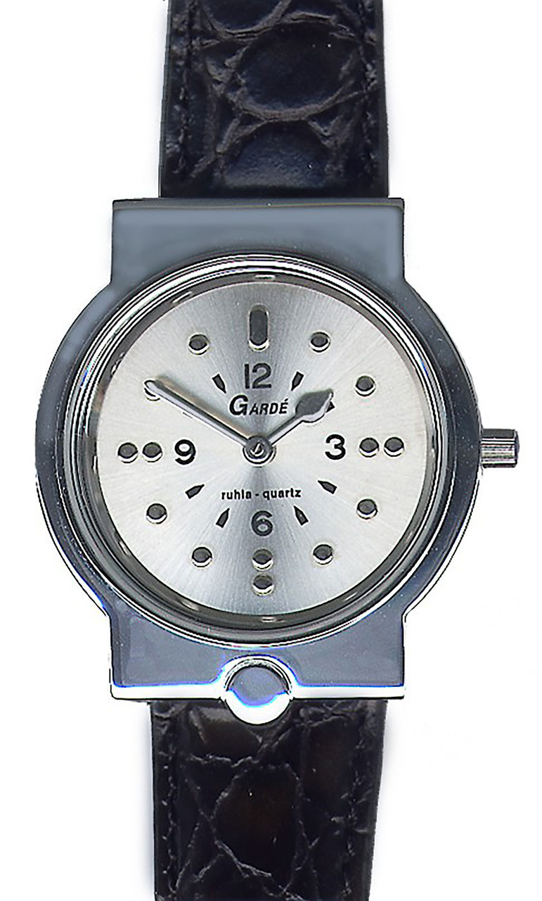 Der thüringische Traditionsbetrieb RUHLA produziert deutsche Qualität mit modernem Twist. Das flache Gehäuse in kühl-silbrigem Edelstahl korrespondiert harmonisch mit dem silbrig-matten Zifferblatt. Die Öffnung des Deckels ist mit einem Punkt betont, die Tastpunkte auf dem Zifferblatt sind flach. Auf der 12 ist ein Strich zu ertasten.